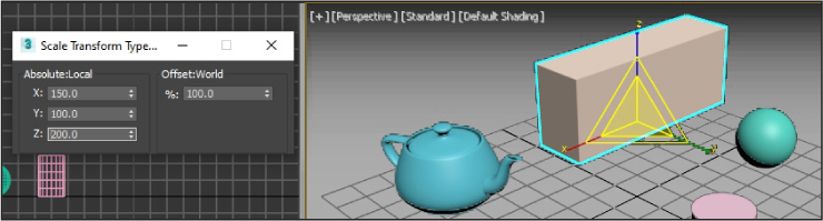 7. Verá como el eje de coordenadas cambia de circular a unos vectores de dirección triangulares. Observe también que el cuadro de diálogo Rotate Transform Type-In ha cambiado su nombre y ahora se llama Scale Transform Type-In. Introduzca el valor 150 en el campo X de la columna Absolute:Local y, en el campo Z, escriba el valor 200.