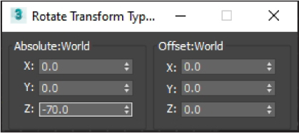 5. En este cuadro de diálogo puede introducir los valores para rotar los objetos en cualquiera de los tres ejes o en varios a la vez. En este caso nos interesa girar horizontalmente la tetera, por lo que vamos a utilizar el eje Z de la columna Absolute:World. Haga doble clic sobre ese campo e introduzca el valor -70.