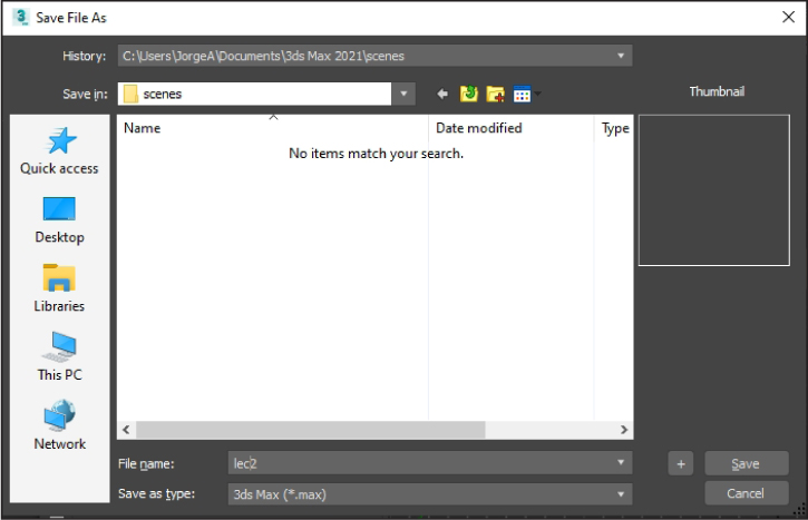17. Se abre de este modo el cuadro de diálogo Save File As, en el que debe especificar el nombre y la ubicación en la que se almacenará el archivo. Por defecto, los documentos creados con 3ds Max se guardan en la carpeta Scenes del directorio 3dsmax, incluido en la carpeta Documentos del equipo, con la extensión .max. Para dar por acabada la lección, en el campo File name de este cuadro de diálogo escriba lec2 y pulse el botón Save.