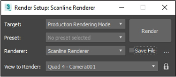 4. El campo View to Render muestra el visor sobre el cual se llevará a cabo la renderización, en este caso, el visor Perspective y, concretamente, desde el punto de vista de la cámara colocada en el ejercicio anterior. Ahora vamos a establecer los parámetros del archivo de salida. Para ello, marque la la opción Save File situada junto al campo Renderer.