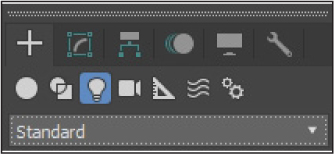 1. Debido a que el tema de la iluminación en 3ds Max es un tanto complejo y se necesita una buena base para poder gestionarlo de un modo correcto, en este ejercicio va a añadir solo dos puntos de luz, equivalentes ambos a una luz cenital. Nuestra intención es situarlos en los dos puntos que ocupan las luces predeterminadas del programa. ¡Empecemos! En primer lugar, haga clic en la pestaña Create, la primera del panel de comandos.