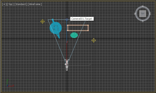 9. Como puede ver en el panel de parámetros, las cámaras en 3ds Max disponen de las mismas características que una cámara real: lentes, campo de visión, etc. Haga clic a 10 unidades de distancia aproximadamente por la parte inferior del centro del visor Top y arrastre hacia arriba hasta unas 6 unidades por encima del centro de ese visor.
