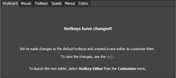 2. El cuadro Customize User Interface cuenta con 6 fichas, una para cada uno de los elementos configurable. La primera de estas fichas, Keyboard, ha sido mejorada en esta versión del programa. Anteriormente, desde este espacio era posible asignar métodos abreviados de teclado a las diferentes acciones del programa. Ahora, los responsables del programa informan al usuario acerca del renovado editor de atajos de teclado, y pueden acceder a la ayuda de dicho editor para obtener la información relacionada.