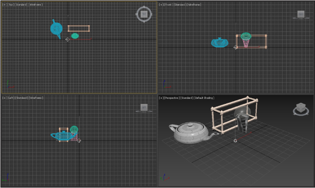 6. De este modo podemos ir comprobando el resultado del proceso de inserción de nuestras luces. De momento, todo va bien (vea el resultado preliminar en la imagen adicional 1.6-2.jpg). Vamos a colocar nuestra segunda luz. Repita los pasos anteriores y coloque el punto de luz en la parte inferior derecha del visor, de manera que ilumine los objetos desde esta perspectiva. Con la herramienta Select and Move, desplace el punto de luz por el visor hasta dar con la mejor ubicación. Aproveche para contemplar cómo las sombras de los objetos van cambiando a medida que desplaza la luz en la escena.
