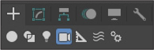 7. Ahora que ya dispone de la escena iluminada, vamos a colocar una cámara. Las cámaras permiten mostrar una escena desde un punto de vista concreto. Como veremos más adelante, podemos configurar los visores para que muestren la vista desde la cámara y, así, poder ajustarla perfectamente. Veamos el proceso para insertar uno de estos elementos. Haga clic sobre el botón Cameras, representado precisamente por una cámara en el panel Create.