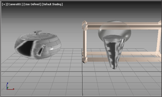 11. Inmediatamente la etiqueta Perspective del visor cambia para mostrar el nombre de la cámara seleccionada, Camera001, y puede observar la escena tal como se ve desde dicha cámara. Ahora es el momento, si lo cree conveniente, de ajustar la posición de la cámara desde otro de los visores. Sepa que puede colocar tantas cámaras como desee e ir cambiando el punto de vista también cuando lo necesite. Termine el ejercicio guardando la escena incrementalmente.