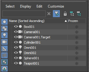 8. El panel Scene Explorer se muestra por defecto en la interfaz del programa y en él se van acumulando todos y cada uno de los elementos que se agregan en una escena. Este panel es una buen manera de controlar el contenido; su barra de herramientas vertical permite, además, filtrar cuáles son los elementos que se quiere mostrar en el panel para, así, poder gestionarlos de forma individual cuando sea necesario. Evidentemente en estos momentos el panel debería mostrarse vacío, pero, si recordamos o recuperamos la escena con la que hemos trabajado en el apartado de introducción, podrá comprobar como, efectivamente, el explorador refleja el nombre de todos y cada uno de los objetos incluidos en ella.