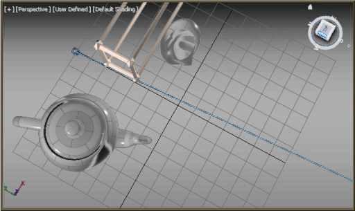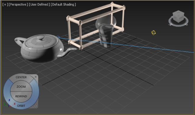 3. 3ds Max dispone de tres tipos de ruedas de navegación: dos básicas, para objetos y para edificios, y una de navegación completa. Por defecto, al activar su visualización, la rueda se muestra en el primero de estos tipos básicos, denominado en el programa View Object Wheel, aunque sepa que puede alternar entre los otros tipos disponibles directamente desde la SteeringWheel o bien desde el menú Views. En cualquier caso, la rueda se encuentra “acoplada” al puntero del ratón, lo que significa que se moverá exactamente por donde se mueva el ratón. ¿Cómo se utiliza esta extraordinaria rueda de navegación? Sencillamente, pulsando sobre la acción que desee realizar y arrastrando el ratón para llevarla a cabo. Por ejemplo, en la rueda básica de nuestra escena, pulse sobre el área denominada orbit y orbite en torno a la escena para visualizarla desde todos y cada uno de los ángulos.