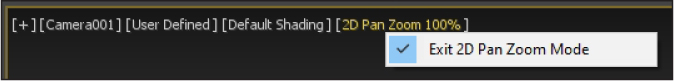 Mientras el modo 2D Pan Zoom se encuentra activo, es posible pasearse o aplicar un zoom sobre el visor, sin cambiar para ello el marco de renderización. Si está utilizando una cámara como punto de visualización, el uso de este modo significa que la posición de la cámara no cambiará. Es preciso tener en cuenta que el modo 2D Pan Zoom no está disponible en sistemas que trabajan con los controladores Direct 3D u OpenGL, ni tampoco en visores ortográficos.