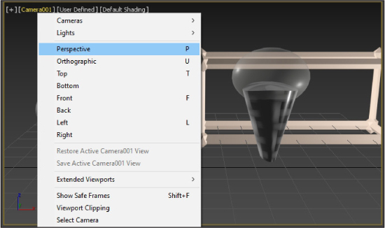 1. En este ejercicio, en el que seguimos practicando con nuestra escena básica de objetos, conoceremos la utilidad del cubo de vistas ViewCube y aprenderemos a configurarlo. Este elemento de navegación se muestra por defecto en la esquina superior derecha de los visores estándares e isométricos, pero no aparece en visores de cámara, de luces o de sombras. Es por esta razón por la que, en primer lugar, cambiaremos la vista de nuestro visor de cámara por Perspective. Para ello, pulse sobre la etiqueta del visor Camera001 y elija la opción Perspective.