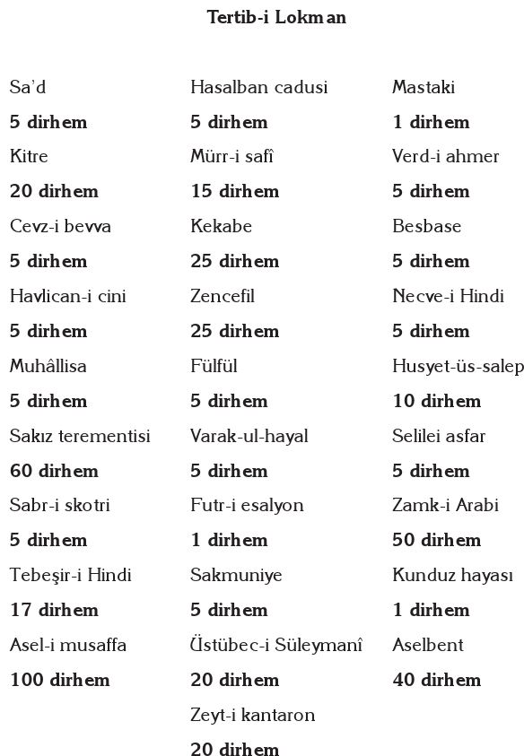 “Bunların cümlesi dövülüp ezildikten sonra, gül suyu ile kâfi miktarda kaynatılıp ılıcak vücuda sürülmeli, karaciğer, dalak ve büyük damarlar üzerleri iyice ovulmalı, sonra tere yatmalı, ertesi sabah hamam yapmalı; dalalete uğrayan organ dâhiliye gelir yerli yerine… Ve amma ki takarrüb-i hatun, istima-i kanun, ekl-i macun, şeytani vesvese-i derun memnu…”
