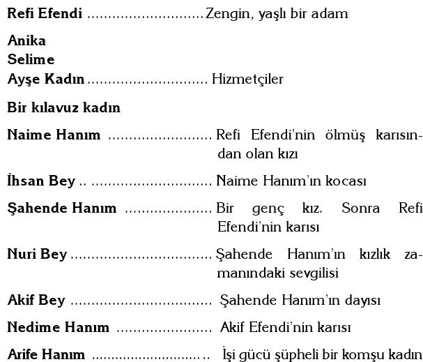 REFİ EFENDİ: Nezihe ile birbirimizi tanıdığımız vakit ikimiz de evli bulunuyorduk. İşte hayatımızı zehirleyen cihet bu oldu. Onun kocası kıskanç, hırçın bir adamdı. Benim karım da pek sinirli ve titizdi. Dünyada akla gelmeyecek engelleri aşmayı göze aldırdık. Geçirmediğimiz tehlike kalmadı. Bu zorluklar sevgimizin ateşini bütün bütün yelpazeledi. Evet, hâlâ şimdi Nezihe’den laf açınca vücudumda bir canlılık, sesimde bir kuvvet duyuyorum. Nezihe, hayatın ihtiyarlık düşkünlüğünü görmeden gençliğinin parlaklığı içinde söndü. Ah, o kara gün… Bunu hiç hatırlamak istemem. Karım da bana bir kız evlat bıraktıktan sonra o da yirmi yıl evvel öldü. Kalbi temizdi fakat çok hırçındı. Zavallının bu titizliğini göz önüne getirdikçe doğrusu ikinci evlenmeye bir türlü cesaret edemedim. Kızım Naime’yi üvey anaya hırpalatmamak bahanesiyle evlenmedim. Kızımı büyüttüm. Evlendirdim. Kızım, kocasıyla şimdi taşrada bulunuyor. Bir saatçik gözümün önünden ayıramazken dört senedir hasret kaldım. Bir buçuk aydan beridir de mektup alamadım. Kocayı bulunca babayı unutuyorlar. Dünyanın hâli böyle. Ben meraktan, ayrılıktan ölüyorum. Hastalık birdenbire üstüme çöktü. Birkaç hafta evvel ne kadar dinç, âdeta genç, ne kadar kuvvetli idim. Bu kısa hastalığı geçirdikten sonra yine eski hâlimi bulacağımı doktor bana sağlamca vadetti. (öksürerek) Bir şey değil, enfluançe. Ama insanı yıkıp bitiriyor… Evet, şimdi böyle hizmetçi kadınların eline kalmış bir hasta bekâr oldum. Hâlimi sormaya gelen eş dostum bana hep evlenmekten laf açıyorlar. Fakat bakıyorum her birinin satılık bir malı var. Evlenmek nasihatinin hemen arkasından kız sağlık veriyorlar. “Filan yerde çok iyi bir duvak düşkünü var. Onu size yapıversek pekâlâ olur.” demekten çekinmiyorlar. Hepsinin dilinde bu… Sonra el altından bu kadınların kim olduğunu öğreniyorum, hiçbiri istediğim gibi değil… En genci kırk beş yaşında. Kart karı suratı görecek olduktan sonra benim evdeki hizmetçilerin ne kabahatleri var?