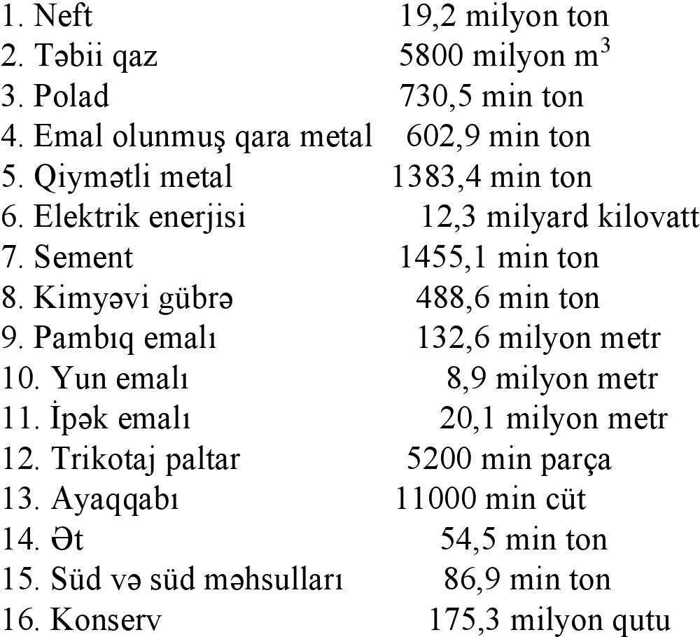1971-ci ildə sənaye məhsullarının istehsalı belədir: