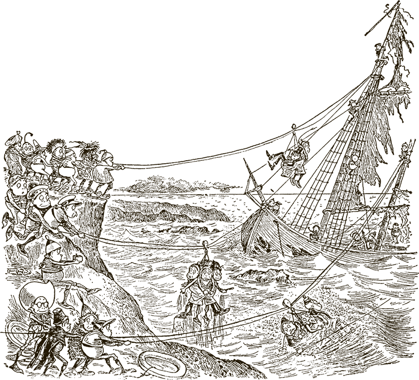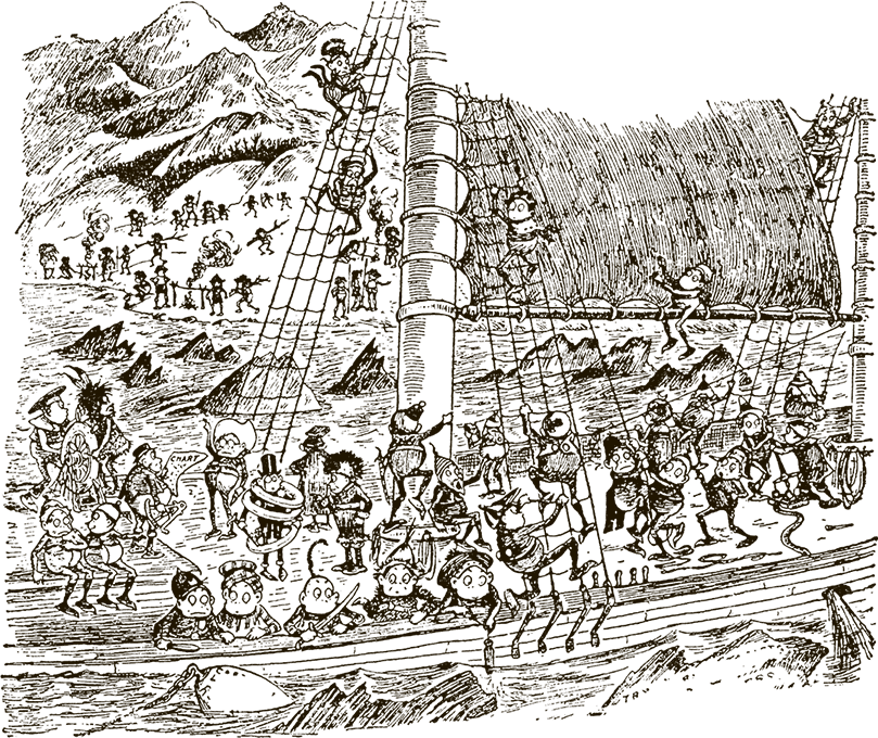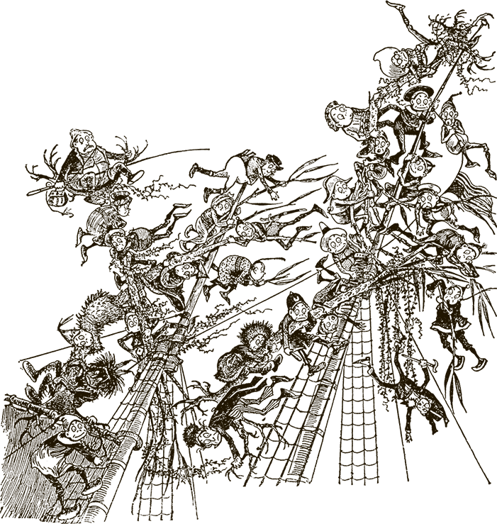 Тут все малютки, один за другим, стали карабкаться на мачты – благо их не успели срубить – в надежде, что оттуда легче будет ухватиться за ветки. А ветер между тем становился всё сильнее и сильнее, и держаться на мачтах удавалось с огромным трудом…