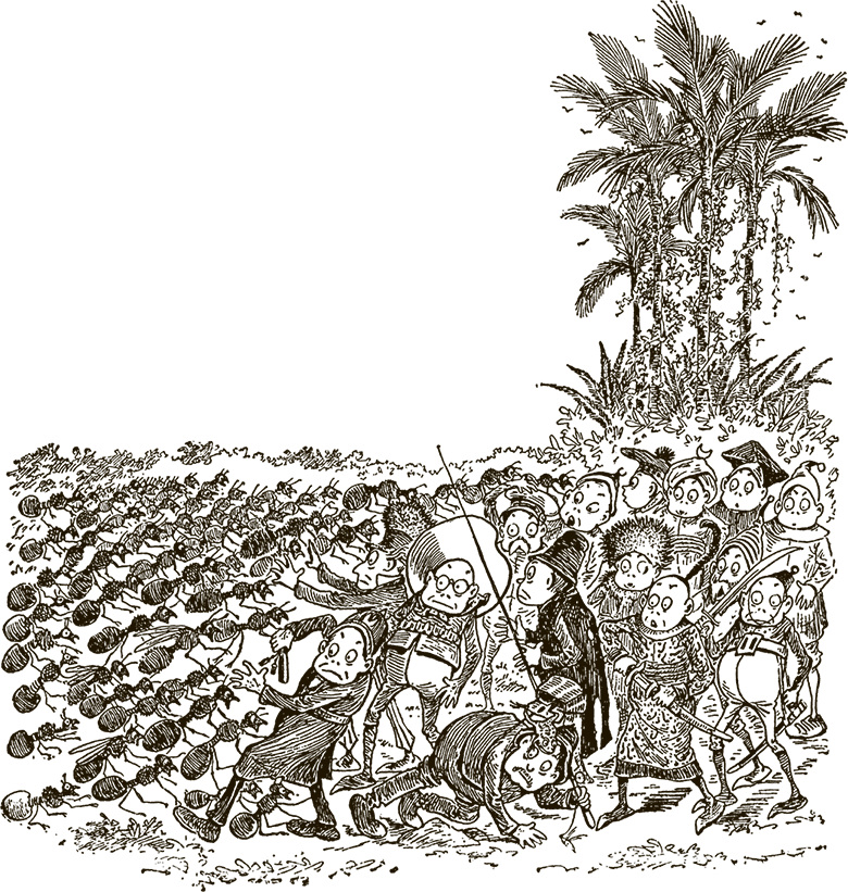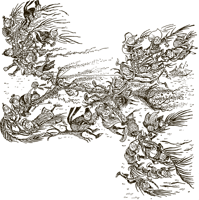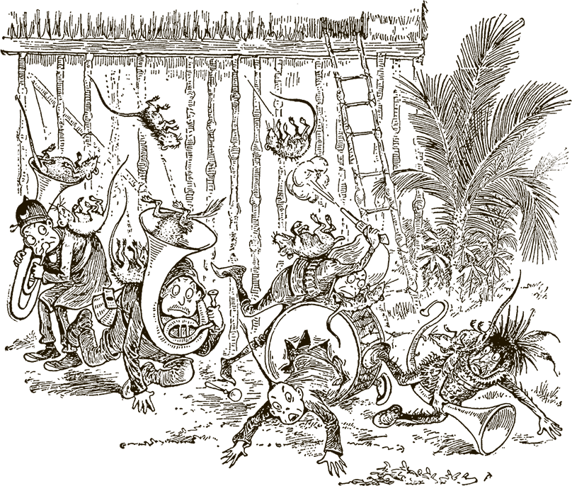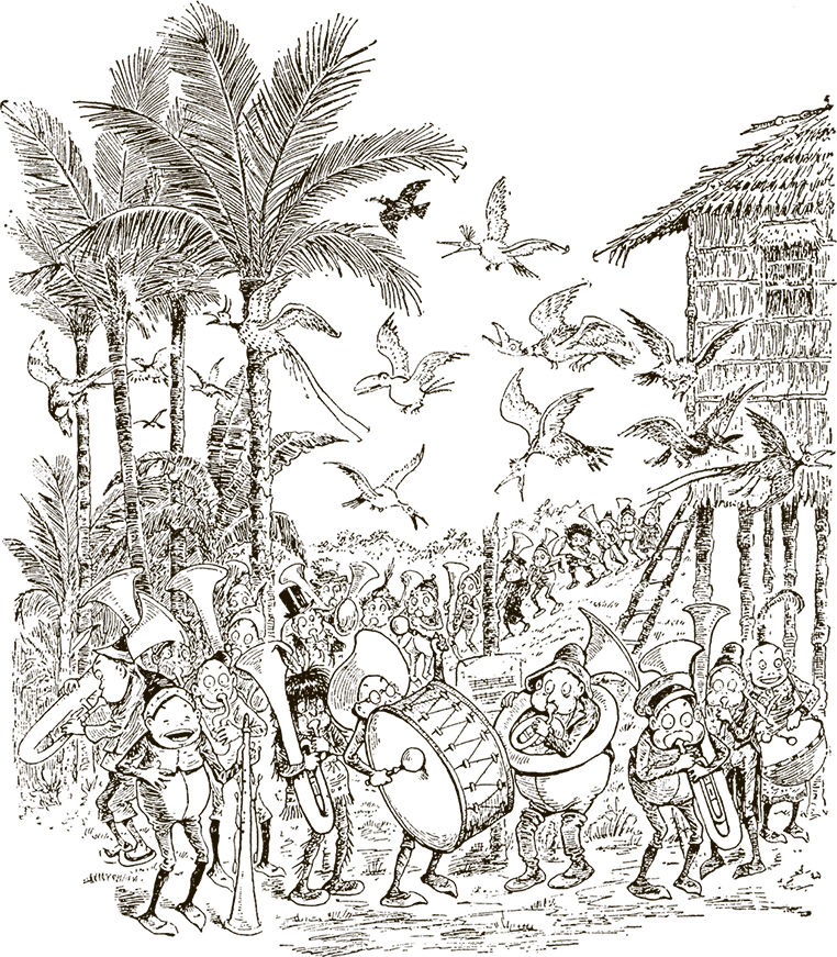 Как маленькие человечки устроили торжественное шествие по берегу острова в сопровождении трофейных музыкальных инструментов, но наткнулись на дикарей и были атакованы полчищами крыс
