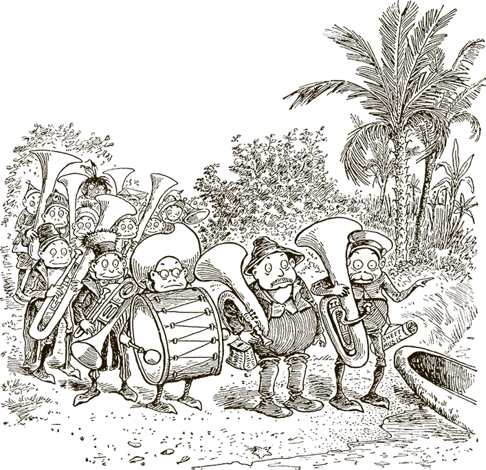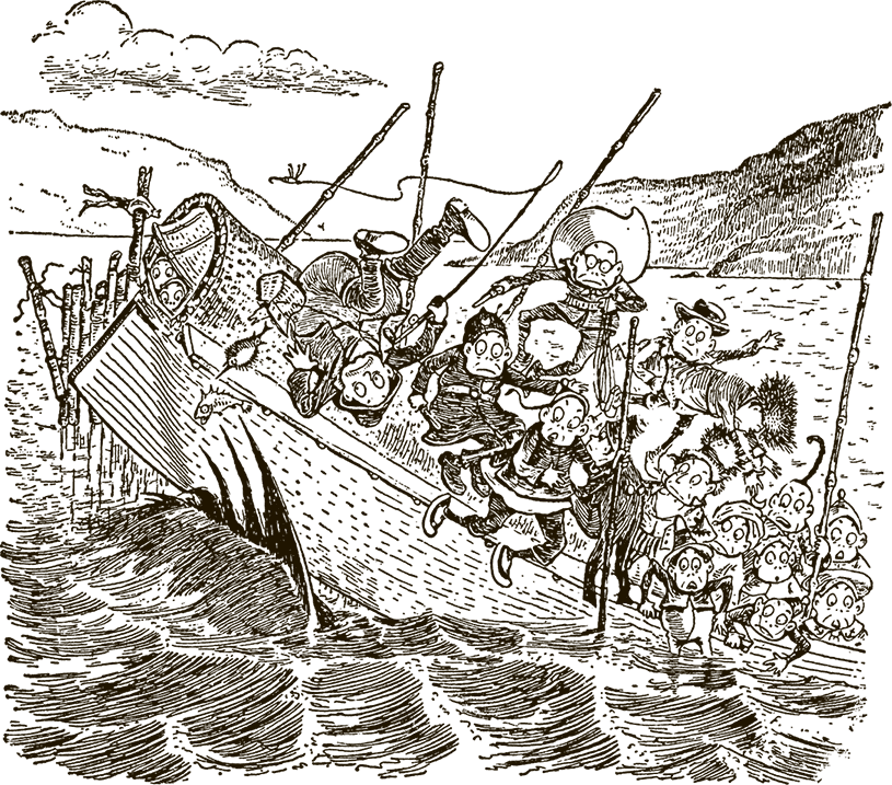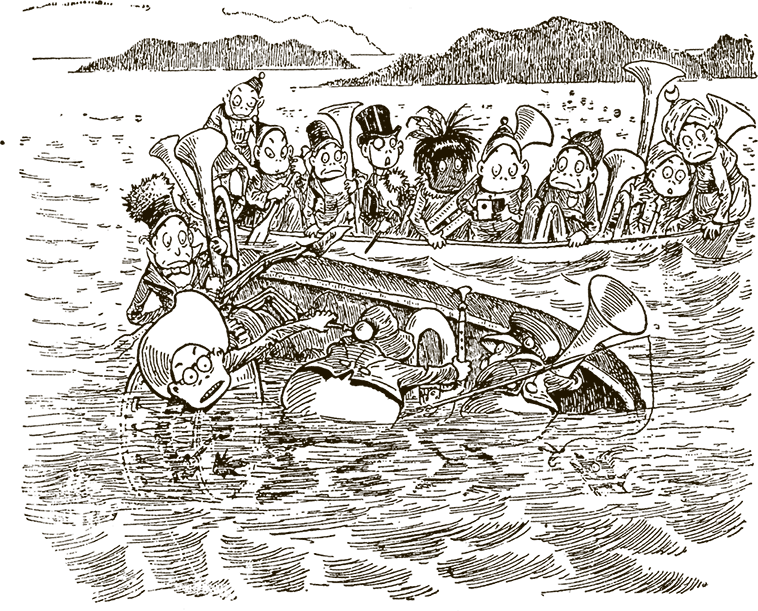 Мне, как дирижёру, следовало бы идти впереди, но я предпочёл место в задних рядах. И не пожалел: едва шедший впереди Мик с большим барабаном, Лим и Заячья Губа с огромными трубами уселись в лодку, как она перевернулась и музыканты очутились в воде, в то время как вторая лодка, в которой вместе с остальными сидел и я, благополучно отчалила от берега и двинулась вперёд.