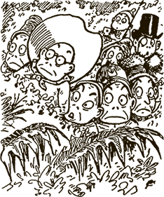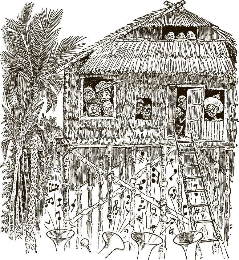 И вот, окружив хижину, мы по сигналу Дедка Бородача дружно заиграли на всех трубах, которые были, да с такой силой и так громко, что из наших инструментов полетели в воздух нотные знаки. Вот как мы играли! Дикари проснулись, в панике подбежали к окнам, но спросонья не могли сообразить, в чём дело. Не обнаружив источника шума, они испугались ещё больше и, повыскакивав из окон, бросились бежать без оглядки.