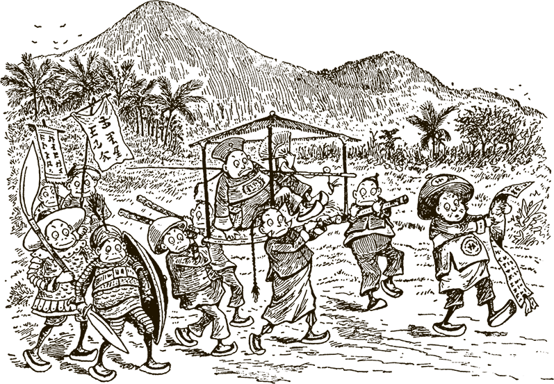 Впереди шёл Скок с трубой, за ним верхом на осле ехал Мик, изображавший китайского генерала, а за ним, в качестве оруженосца, – Знайка. Далее следовали носилки, в которые усадили Лима, а несли четыре эльфа. Любитель рыбалки заявил, что отныне будет считать себя мандарином – важным китайским сановником. Перед носилками вышагивал Микробик с большой китайской грамотой в руках и громко выкрикивал: