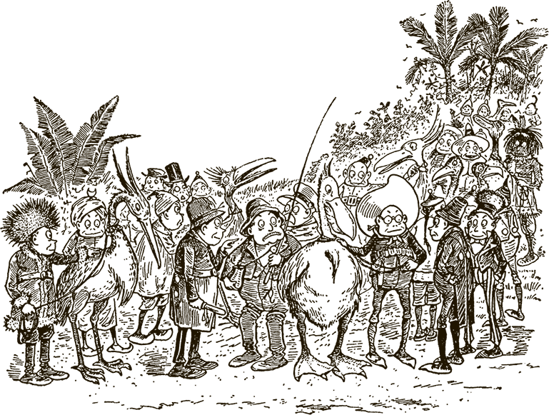 На следующий день Мик и Лим действительно вывели на лужайку огромных птиц и объявили:
