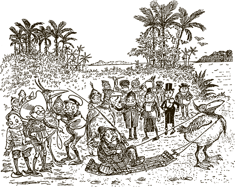 – Надо спасаться, а то утонем! – крикнул Заячья Губа. Спрыгнув за борт, мы с трудом вплавь добрались до скал, торчавших из моря. Хоть мы и спаслись таким образом от грозившей опасности, положение наше оставалось весьма и весьма печальным: без еды и пресной воды нам грозила ужасная смерть от голода. Вдобавок не давали покоя огромные птицы, которых мы спугнули. Они с криком кружились над нами, а некоторые, самые храбрые, даже садились на скалы с явным намерением кого-нибудь из нас схватить. И вот одна из птиц, спустившись на верхушку скалы, куда первым вскарабкался Незнайка, схватила его своим клювом и взлетела. Незнайка поднял крик, стал барахтаться, и птица то ли испугалась, то ли ей стало жаль маленького человечка, но, сделав круг над скалой, опустилась опять и поставила Незнайку на камень, перепуганного, но целого и невредимого.