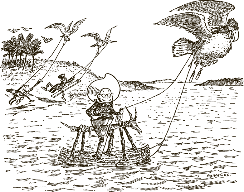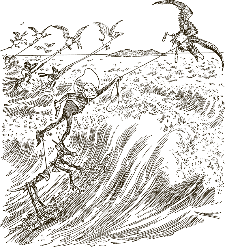 На следующее утро он спустил в воду очень странного вида лодку, на которой была укреплена деревянная лошадь. Мик уселся на неё верхом, словно на настоящую, предварительно привязав лодку длинной верёвкой к большой птице, остававшейся на берегу.