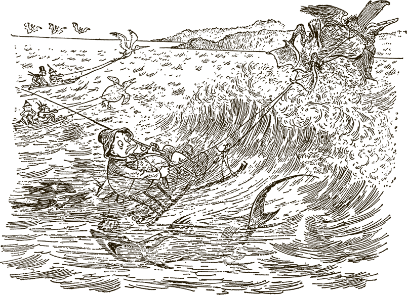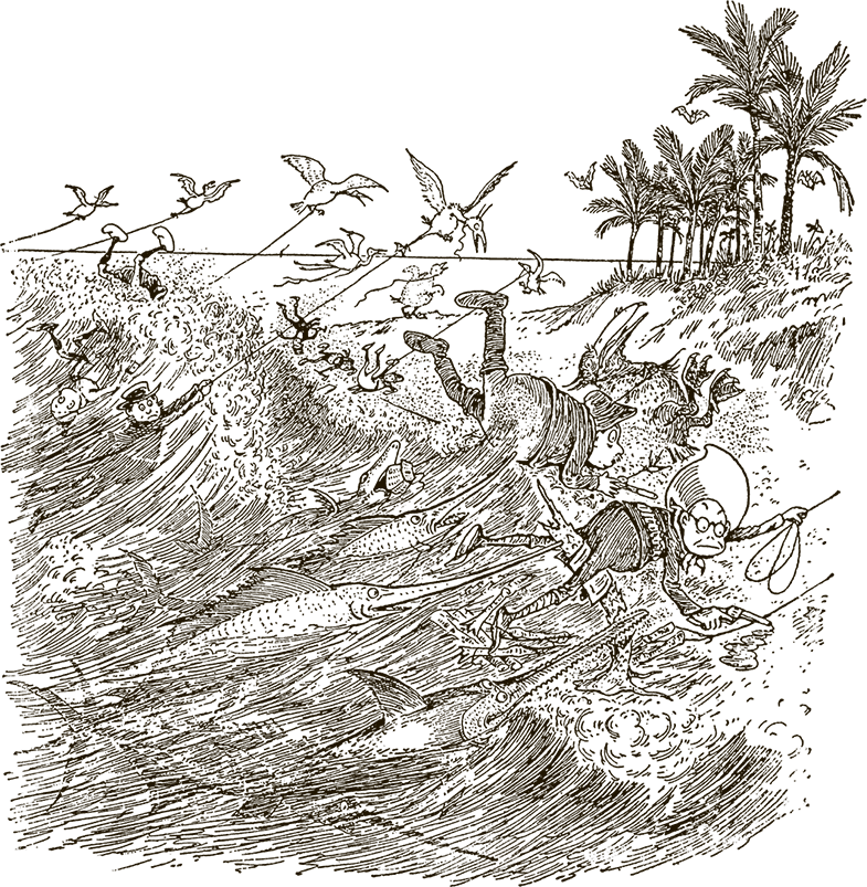 Мик выстрелом из револьвера дал сигнал к началу гонки, и тут произошло то, чего никто не ожидал: напуганные выстрелом, птицы сразу взмыли в воздух. Как бы хорошо они ни летали, долго удержаться на высоте не могли из-за привязанных к ногам гирь и вскоре начали снижаться. Скорость при этом, однако, оставалась приличной, так что горе-дрессировщики Мик, Тюбик-Мазь, Лим, да и все мы очутились в воде.