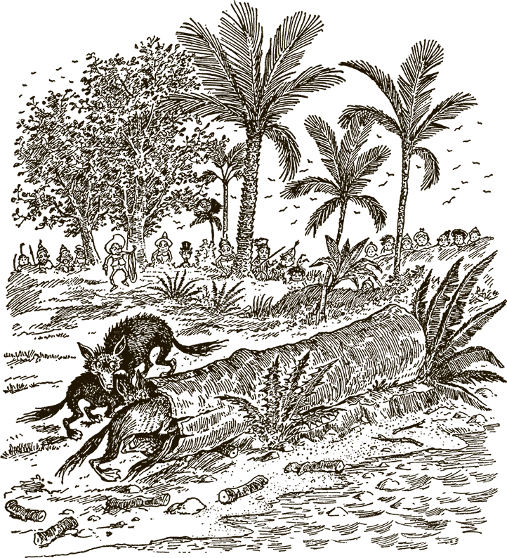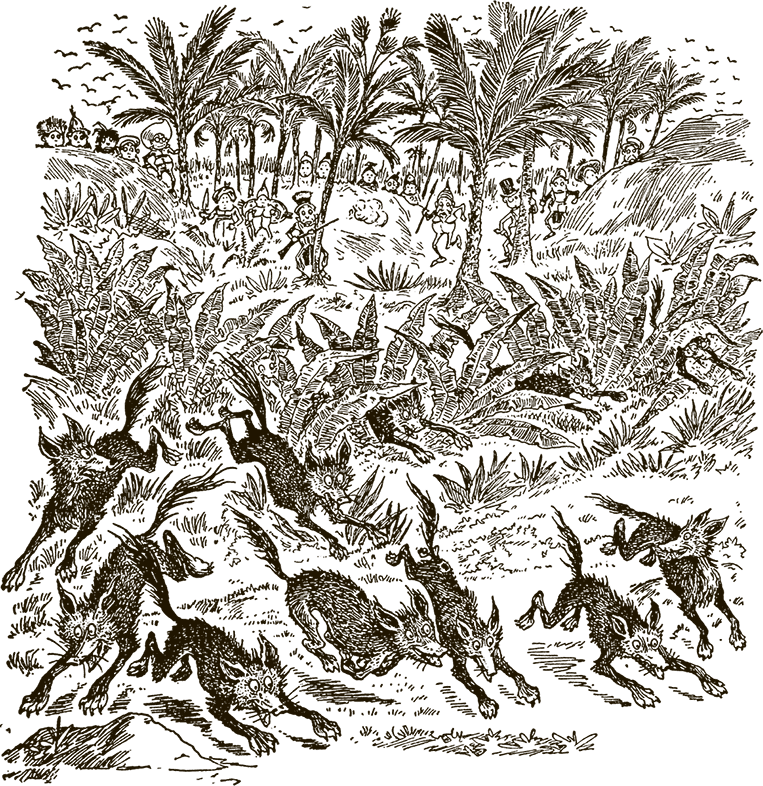 Наши эльфы с громким криком, высоко поднимая свои пики и сабли, погнались за ними. Я не побежал с другими, зачем? Лучше встать под высокой пальмой, взвести курок и подождать, пока волк сам отважится приблизиться ко мне. Тогда я тут же уложил бы его на месте.