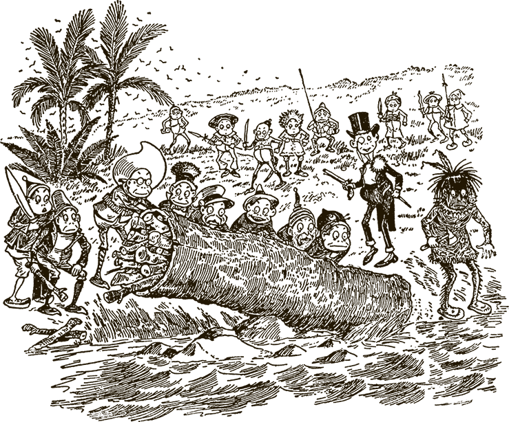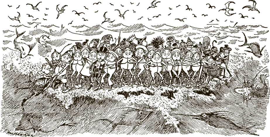 Как лесные человечки после долгих споров оказались на пароходе, но налетели на подводную скалу, чуть не погибли от голода и жажды и к тому же подверглись нападению птиц