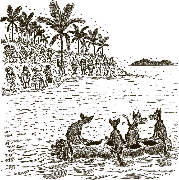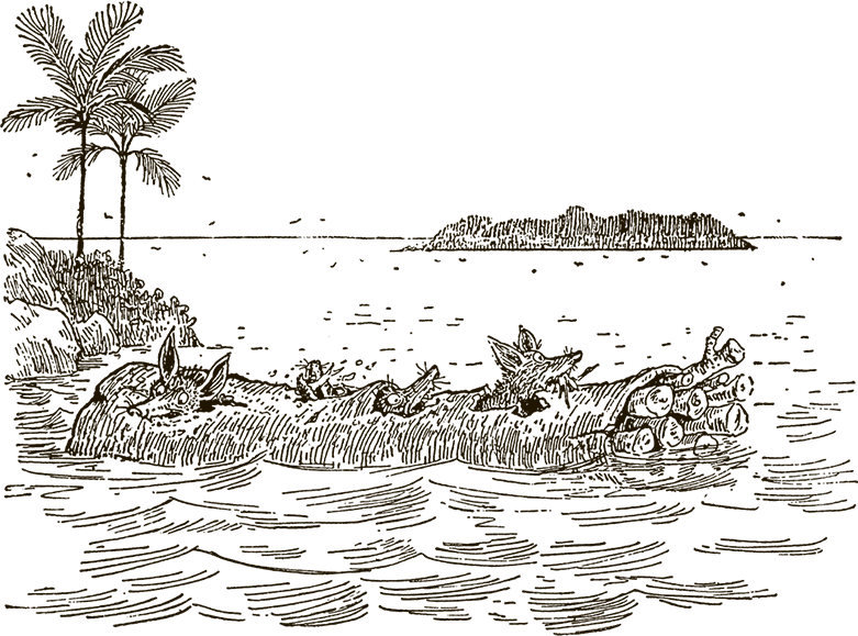 В этот раз раздалось сразу два выстрела… и второй точно был мой. Я стрелял оттуда, где стоял, из-под высокой пальмы, и от грохота чуть было сам не упал, но волкам наш залп не причинил никого вреда. Между тем бревно с сидевшими на нём волками отплывало всё дальше от берега и вскоре совсем исчезло из наших глаз. Так мы и не истребили ни одного хищника, а стало быть, и не заработали ни единого доллара.