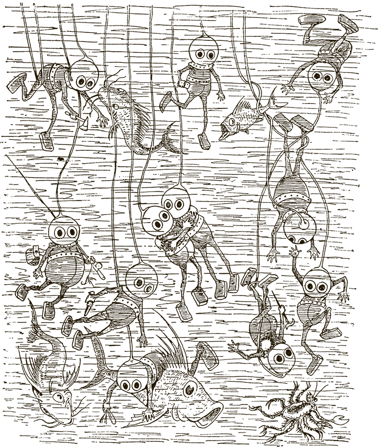 После этого приключения мы выбрались на сушу, тем более что никаких волков на дне морском не оказалось. Как только Знайка закончил фотографировать под водой рыб, мы стали подниматься наверх, и опять не обошлось без приключений: мы с Фунтиком перекувырнулись вниз головой и запутались в резиновых трубках. Нет, я, конечно, не испугался, да и кончилось всё благополучно, но, очутившись на земле, долго не мог прийти в себя. Мне всё казалось, что я ещё под водой, и я дрыгал руками и ногами, точно отбиваясь от морских рыб. Вот и доктору, когда тот подошёл ко мне, чуть не заехал тросточкой.