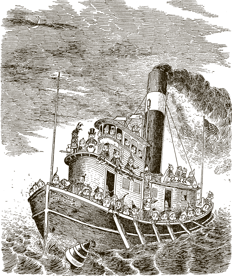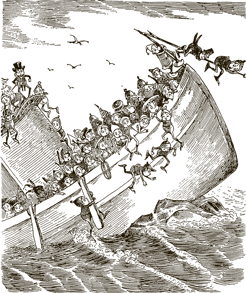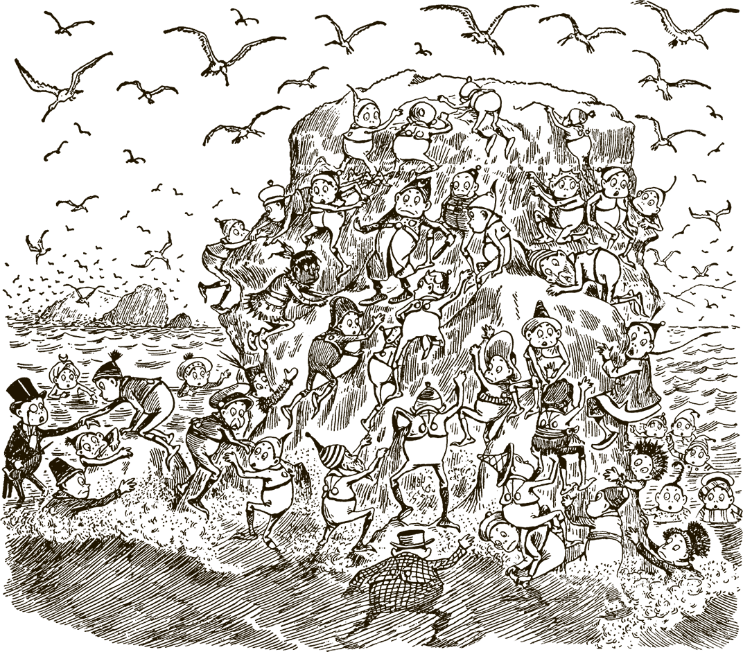 Все, кроме меня, были страшно изнурены, а некоторые из лесных малюток, добравшись до берега, рухнули на землю без чувств. На беду, в числе последних оказался и доктор Тюбик-Мазь, так что некому было помогать больным или упавшим от усталости в обморок. Пришлось мне взять на себя его обязанности. Вытащив из карманов его фрака склянки с лекарствами, одному я дал понюхать нашатыря, другому влил капли в рот, третьему смазал царапину на лбу.