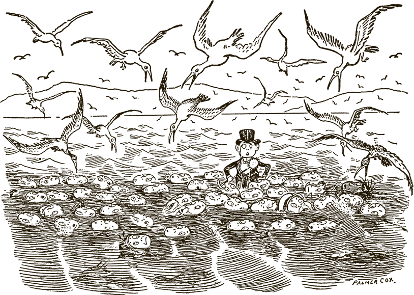 Несносные морские птицы теперь кружили прямо над торчавшими из воды головами. Казалось, спасенья нет: кто не утонет или не попадёт в пасть акулы, того схватит птица. Конечно, струсили все, и лишь я один держался смело, а если и дрожал, то не от страха – просто вода в море была ужасно холодная…