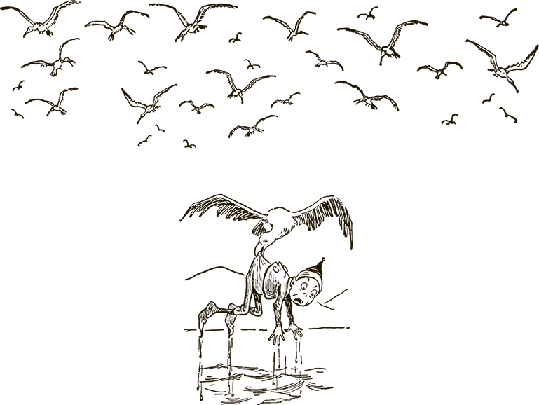 Сгрудившись на самой вершине, мы со страхом думали, что вот-вот очутимся в воде и станем добычей акул и других морских хищников, сновавших вокруг. Вдобавок над нами кружились эти несносные морские птицы, в любой момент, казалось, готовые либо ударить клювом, либо утащить. Индеец чуть было не свалился прямо в пасть какой-то рыбине, но его, хоть и с трудом, удержал Всезнайка.