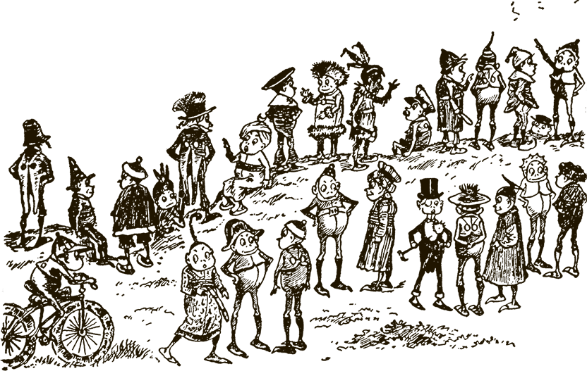 Среди малюток поднялся страшный переполох: одни бежали вперёд, другие пятились назад, многие падали на землю и на четвереньках ползли куда глаза глядят.