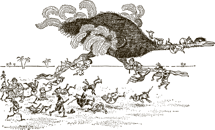 Это обстоятельство так разозлило страуса, что он во весь дух пустился по дороге, и никто из нас, лесных малюток, не смог удержаться на его спине. Первым слетел я, за мной и все остальные, по очереди, в зависимости от того, кто за что сумел уцепиться.