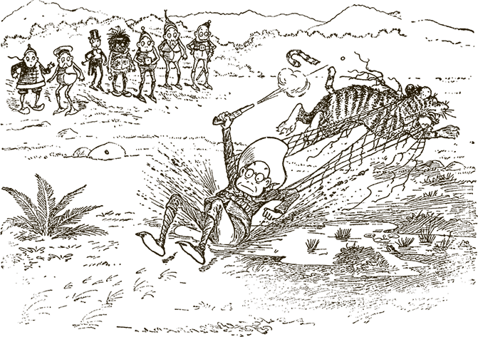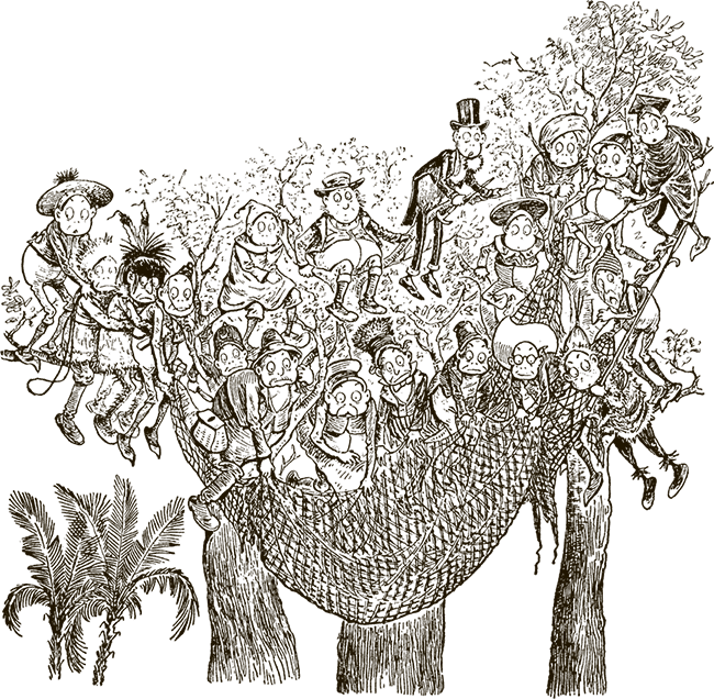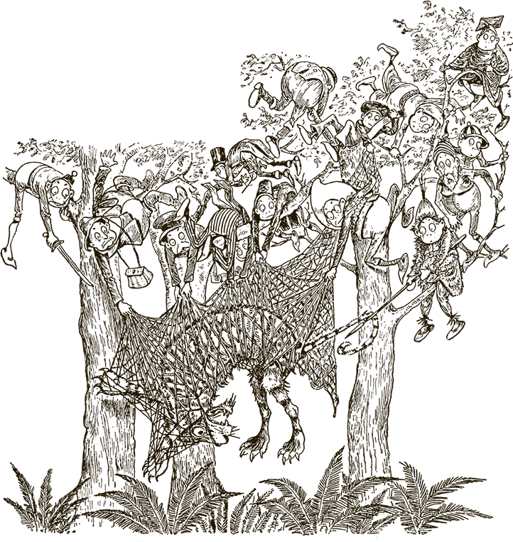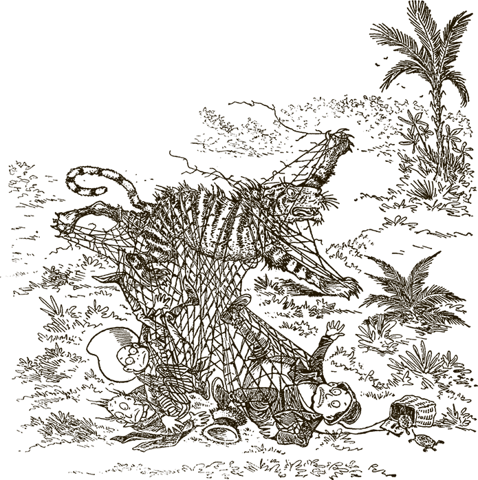 С замиранием сердца потянулись сотни ручек к верёвкам. Скок выхватил саблю, Эскимос – длинную пику. Но тут случилось то, чего малютки не могли никак себе объяснить: в ловушке вместе с тигром каким-то образом очутились Учитель, Лим и Мик. Все вместе они в гамаке и рухнули на землю.