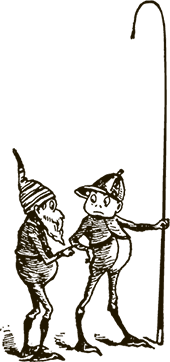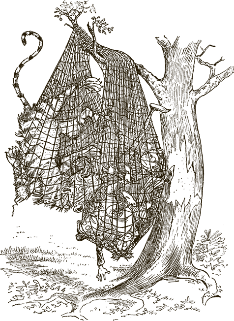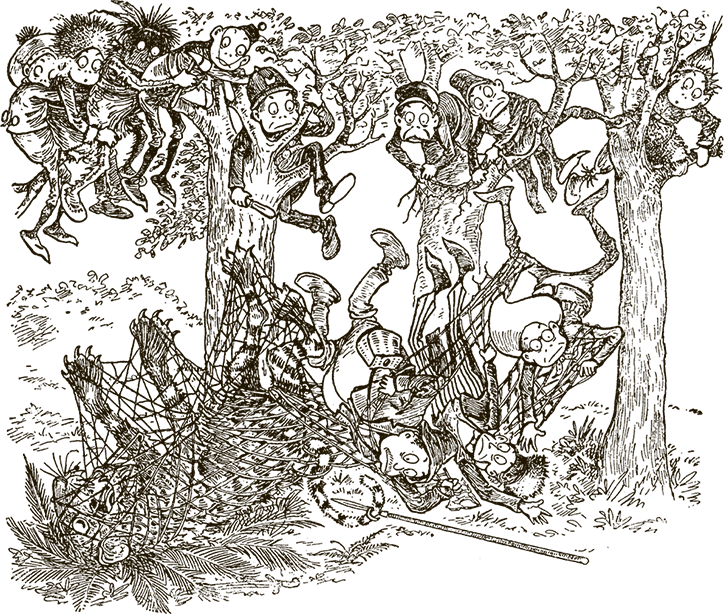 Эльфы нашли подходящую группу деревьев, крепко-накрепко привязали к ним гамак и подвесили так, что при попадании в него чего-нибудь тяжёлого верёвки сверху стягивались и то, что находилось внутри, не могло вывалиться. Для большей прочности малютки продели через петли множество верёвок, чтобы гамак стал похожим на мешок. Опробовав крепость гамака, все остались довольны. Затем малютки забрались на деревья и стали ждать.