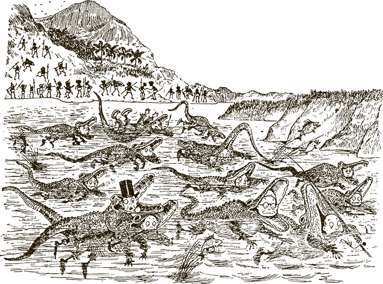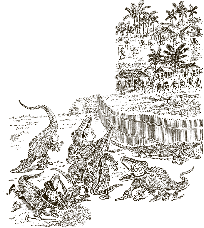 Едва он успел договорить, как из хижин выскочили десятки вооруженных луками туземцев и с криком побежали к забору, нацеливая свои стрелы прямо на мнимых крокодилов.