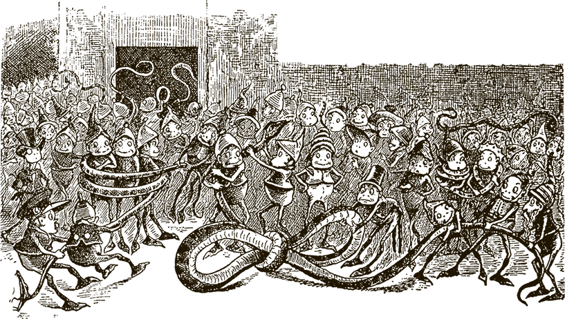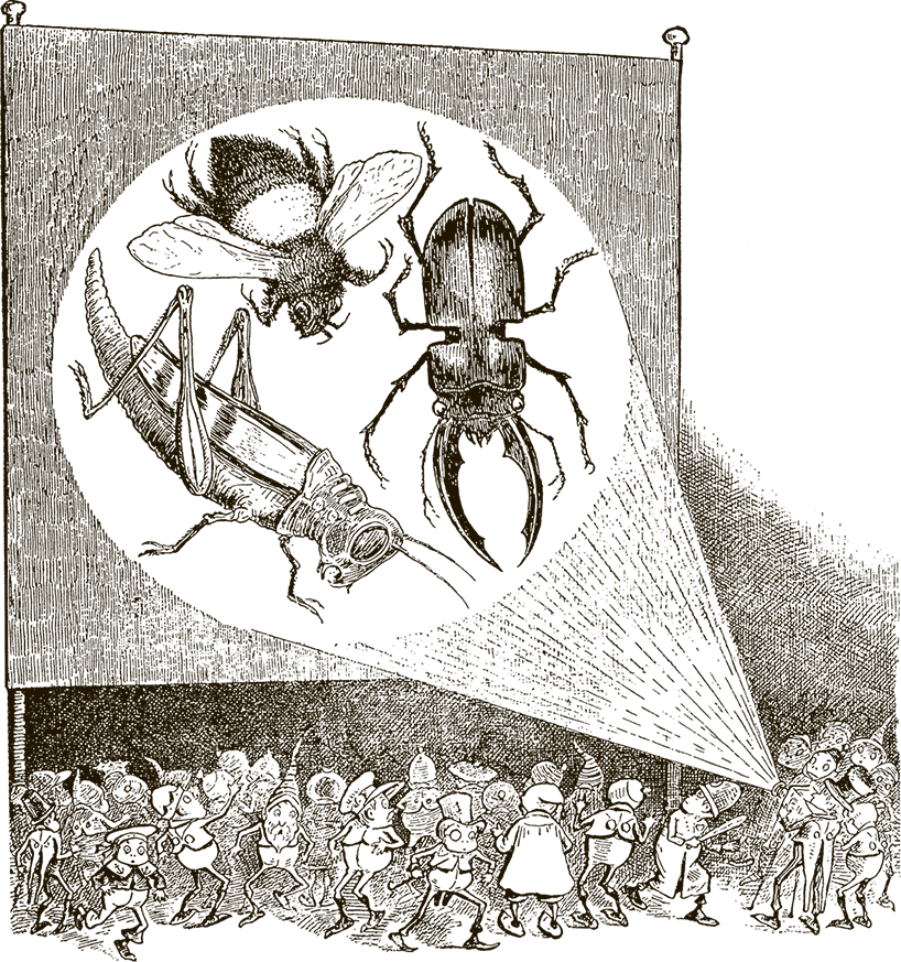 Не говоря ни слова, он прошёл в эту комнату, незаметно вставил в волшебный фонарь пластинку с нарисованными мухой, саранчой и жуком, зажёг крошечную лампочку, и на белом экране тотчас появилось увеличенное во много раз изображение этих насекомых.