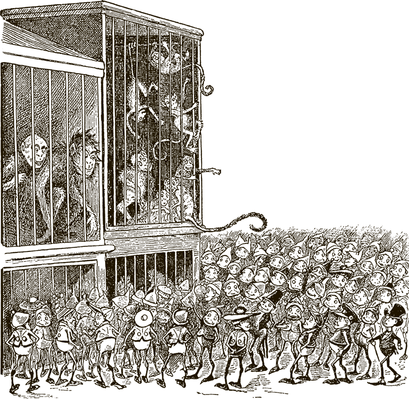 В зоологическом саду малютки оказались только поздним вечером, когда посетителей уже не было, а все звери сидели в закрытых павильонах. Первым, кого они увидели, были самые разные обезьяны.