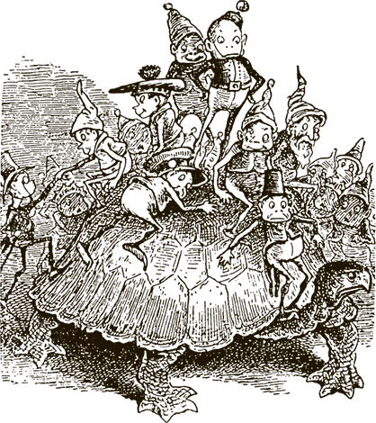 Увидев на полу огромную, как гора, черепаху, малютки с визгом и писком стали карабкаться к ней на спину, а Пучеглазик всех подгонял: