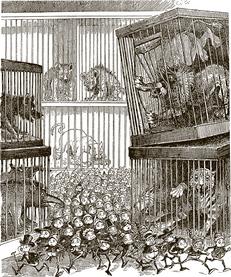 Услышав рычание льва, все остальные звери будто взбесились и начали реветь и метаться по клеткам. Тигр, широко разинув пасть, просунул сквозь прутья свою страшную лапу, пытаясь схватить кого-нибудь из малюток; пантера, с налитыми кровью глазами, стала биться головой об клетку, как будто намереваясь вырваться на свободу.