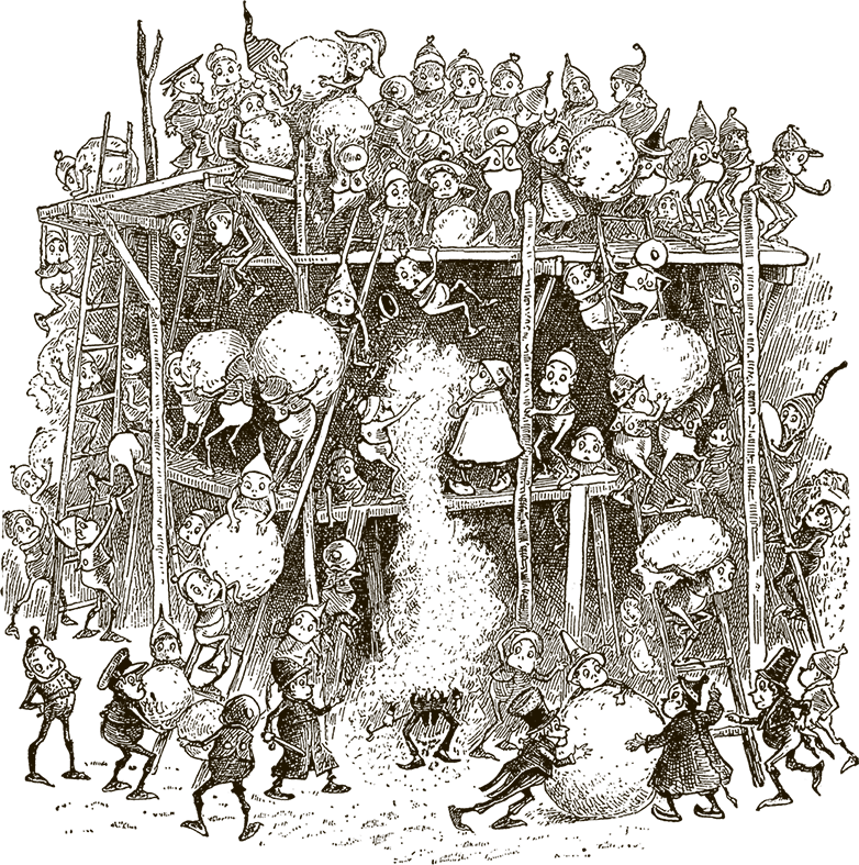 Только Вертушка с Читайкой успели забраться на самый верх, как зазевавшийся Читайка сорвался с лесов и полетел кубарем в рыхлый снег, откуда братья с трудом его вытащили. Едва малютки оправились от испуга и принялись за работу, как Тишка с Мишкой из-за чего-то поспорили, в пылу спора выпустили из рук глыбу снега, и та, рассыпаясь, полетела вниз. Тотчас же раздался отчаянный крик Мурзилки – и всё стихло. Эльфы в ужасе бросились к тому месту, где только что стоял их товарищ, и поспешно принялись разбрасывать снег.
