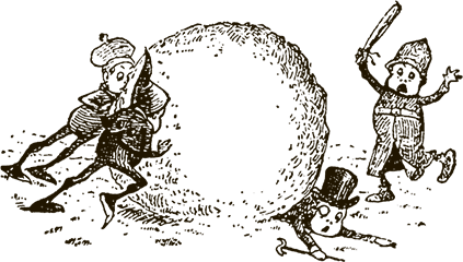 Дедок Бородач подкатывал громадные комья снега, Тишка с Мишкой от него не отставали и ухитрялись скатывать такие большие снежные шары, что остальные только ахали от удивления. Работа кипела, материал с быстротой молнии передавали снизу вверх, и фундамент увеличивался с каждой секундой. Не обошлось, конечно, без приключений.