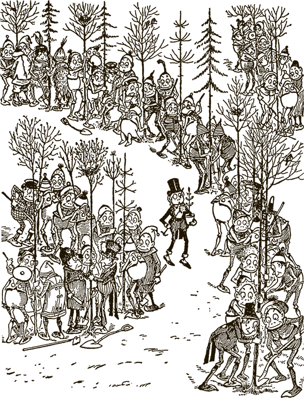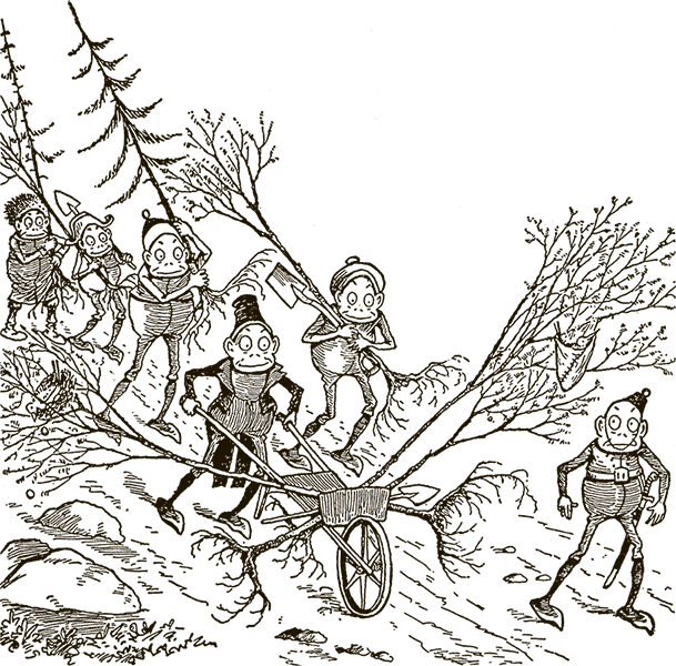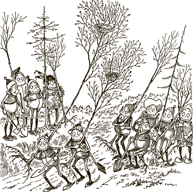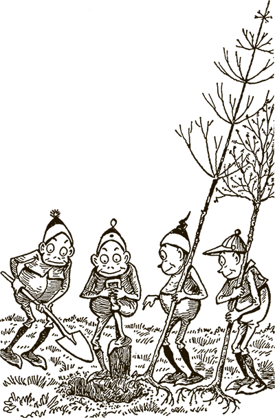 Выкопав достаточное количество деревцев, эльфы взяли каждый по одному и понесли на полянку, а доктор Тюбик-Мазь где-то нашёл тачку и вёз сразу два.