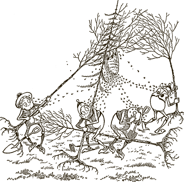 – Ой-ой-ой! Помогите! – вопили что есть мочи малютки, пытаясь размахивать деревьями, чтобы спастись от напавших на них и сердито жужжавших ос.