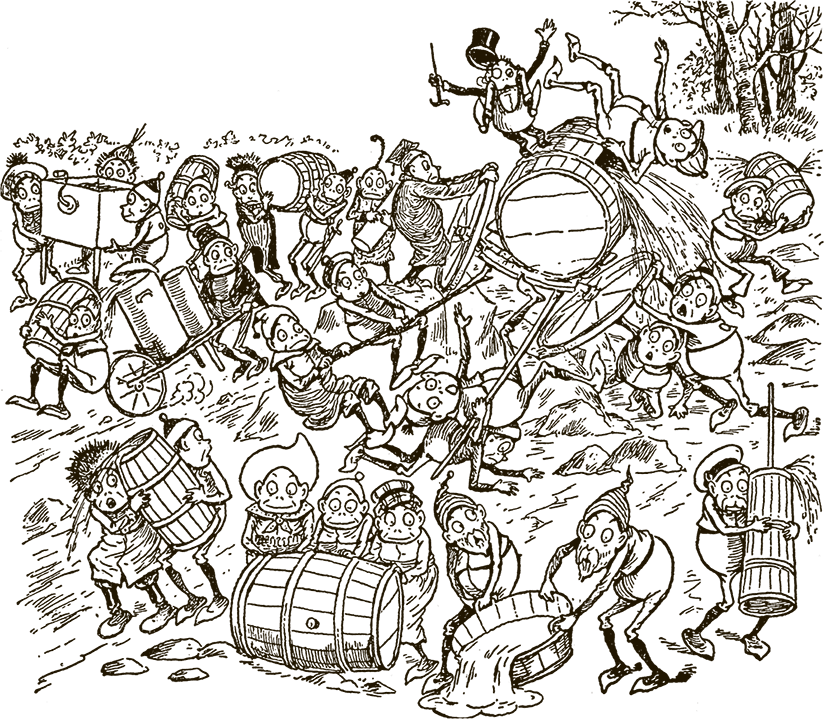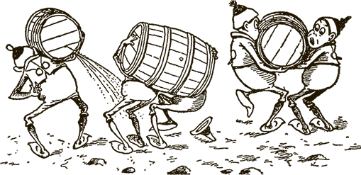 – Давайте поможем! – предложили Мурзилка и Скок, но, вместо того чтобы двигать бочку, сели на неё верхом, отчего та, конечно, стала ещё тяжелее.
