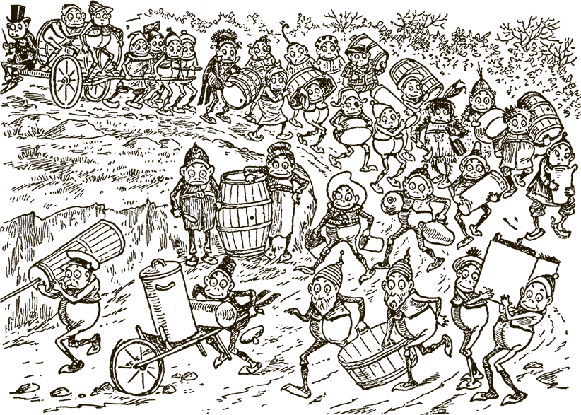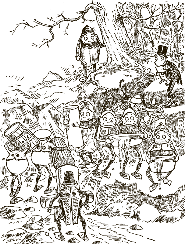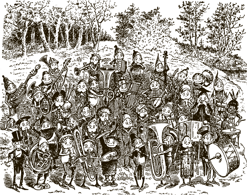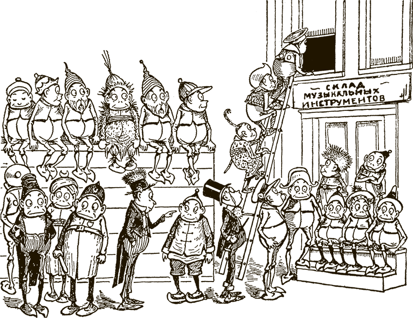 Лесные человечки тотчас же один за другим забрались по лестнице в помещение склада, и уже через минуту в их руках очутились трубы, флейты, барабаны, гармоники, арфы, балалайки. Весь склад наполнился какофонией, совершенно непохожей на музыку.