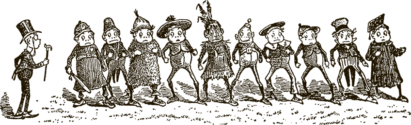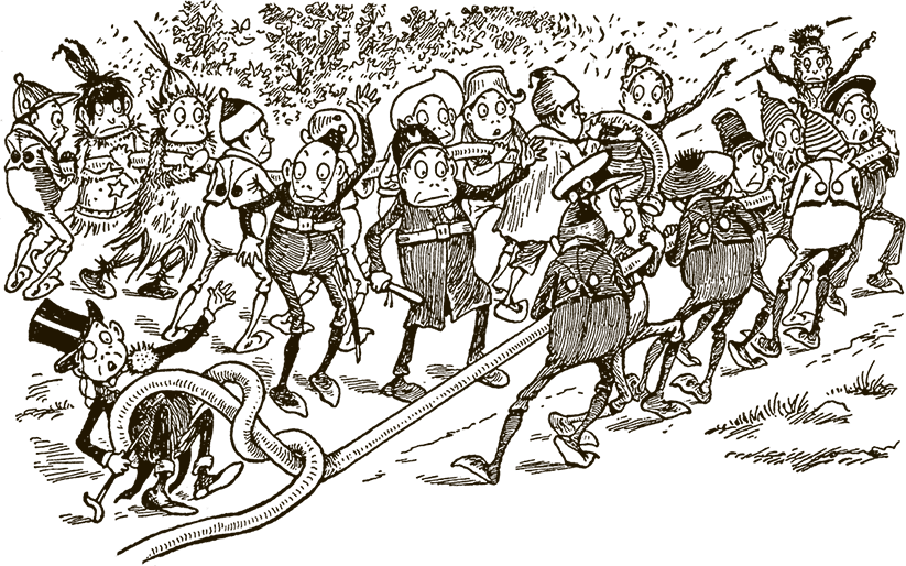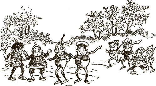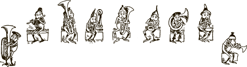 Впереди, конечно же, шёл Мурзилка, со своей тросточкой в одной руке и корнета-пистоном – в другой. Незнайка дул в трубу, Тюбик-Мазь играл на флейте, Чумилка и Индеец – на барабанах, Заячья Губа – на тромбоне. Остальные инструменты эльфы тоже распределили между собой, причём всем не просто хватило, а хватило с избытком. С пустыми руками не шёл никто, а у некоторых было даже по два-три инструмента.