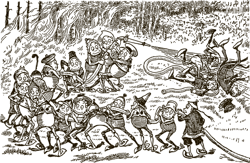 Вот наконец малютки дотащили бочонки с водой до пылающего парка.